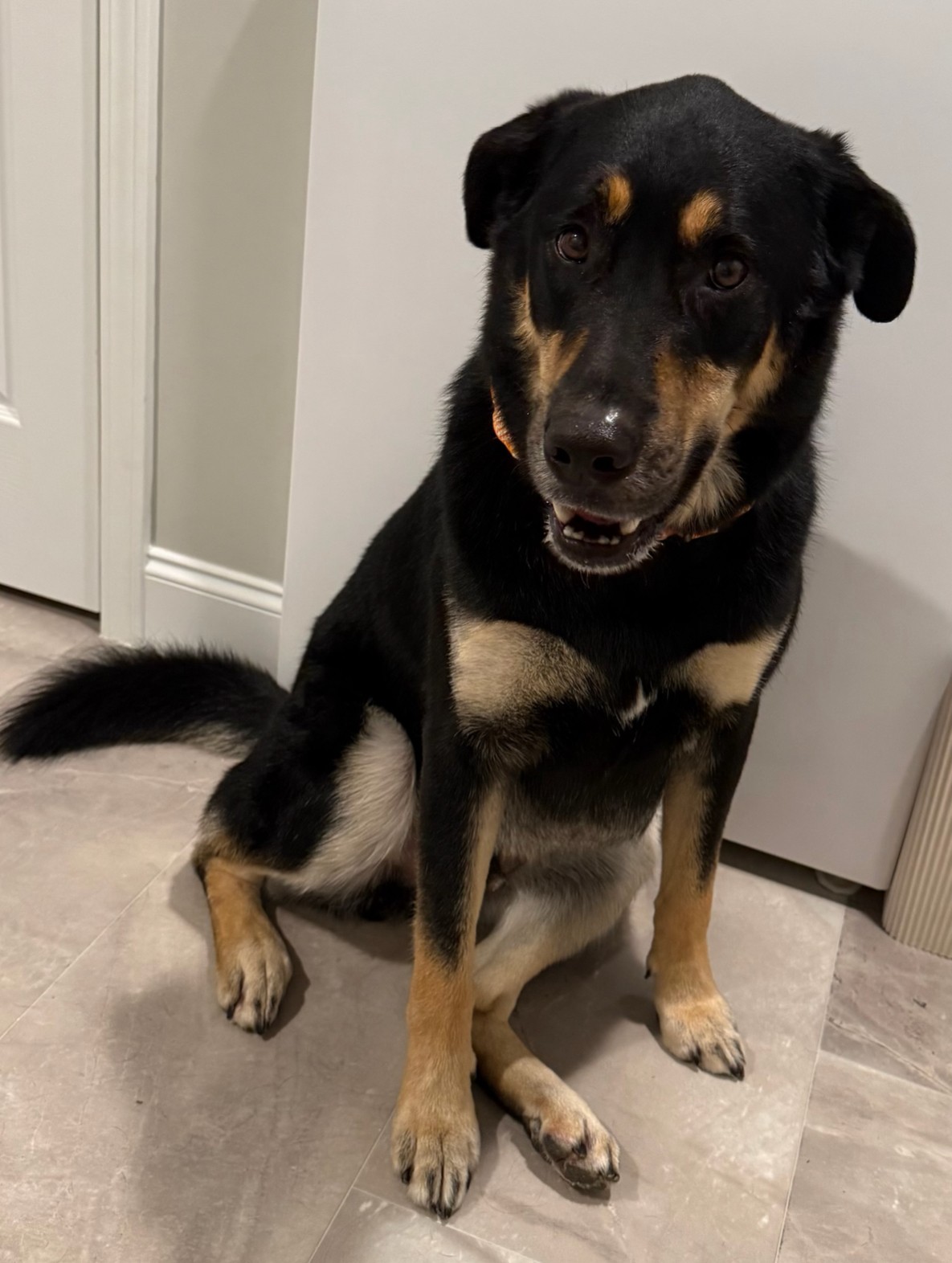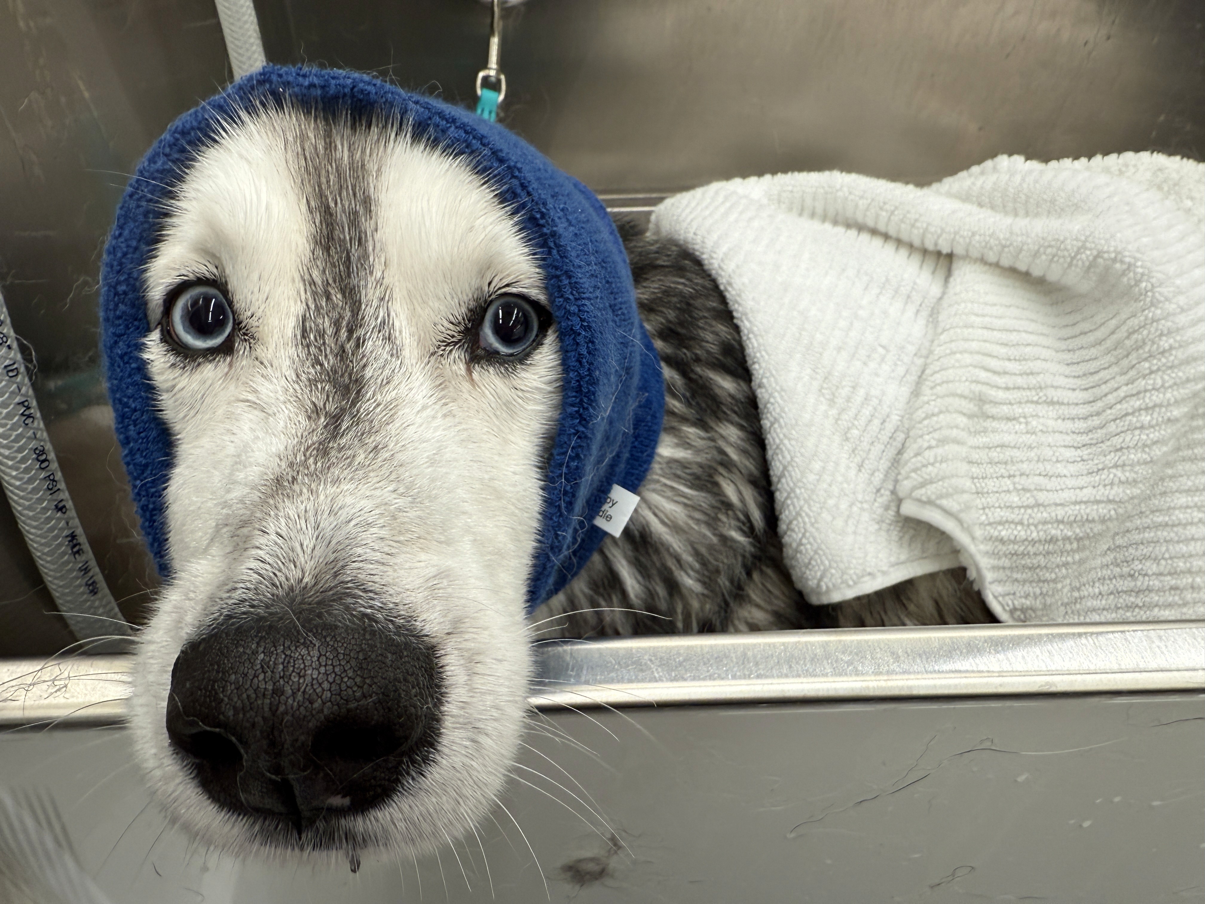 Double-coat care. De-shed specific coat prep & bath routine, blow-dry, face/feet tidy, sanitary trim, nails & ears.